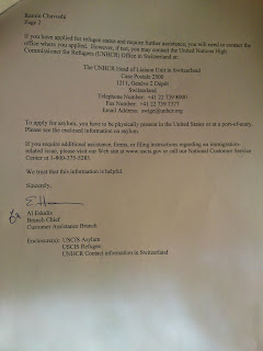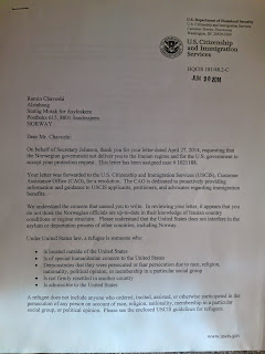 این نامه 2014jun    برایم  با پست  از سوی  وزیر ایالات متحده ارسال شد. که  برایم در خاک ایالات متحده  بطور غیابی پرونده پناهندگی باز نموده. که گواه خیلی مسائل  مطلع بودن دیگر کشورهاست از وضعیت من است .